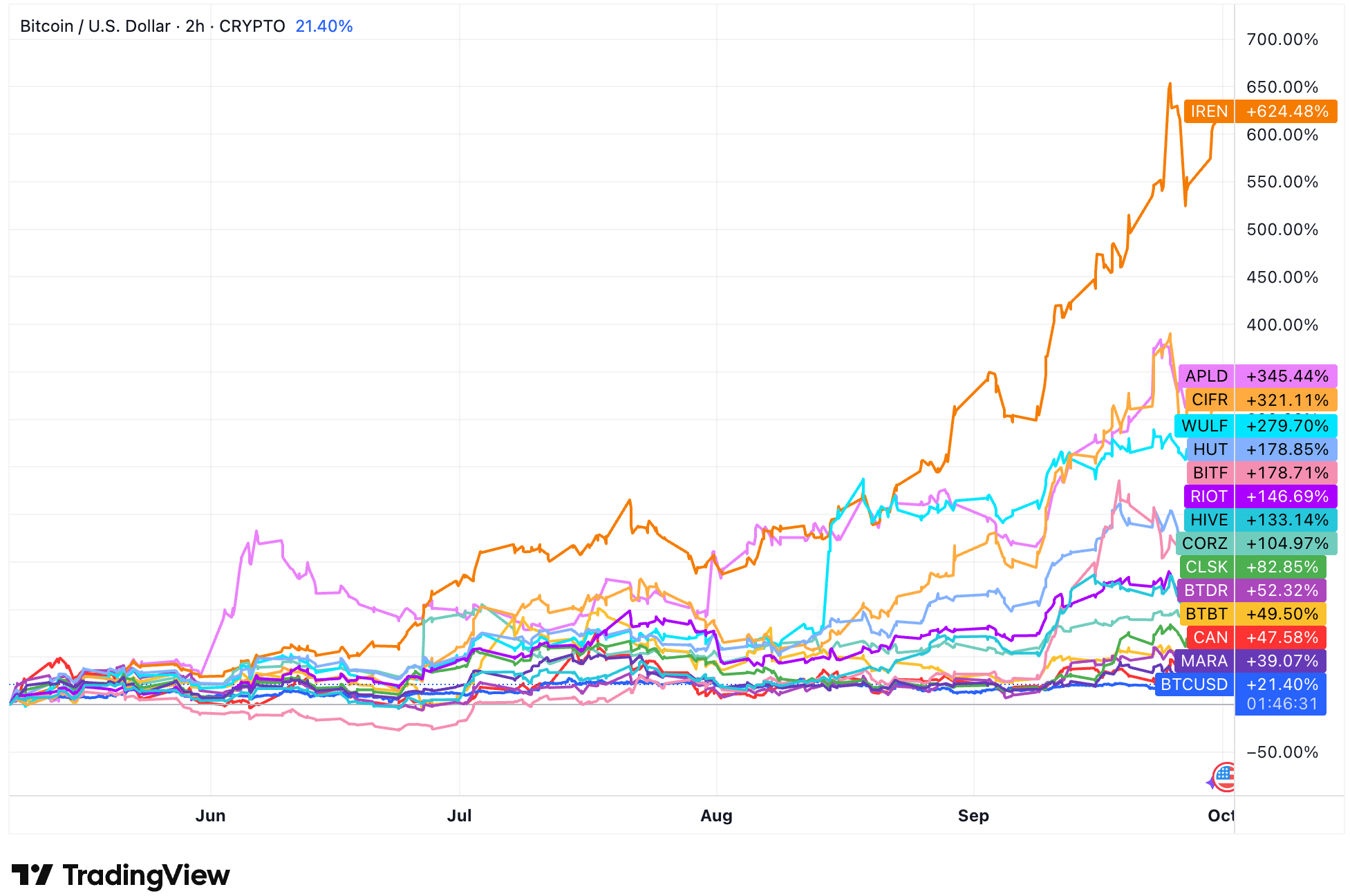 Even the larger names such as CleanSpark (CLSK), Bitdeer (BTDR) and MARA, posted double-digit returns well above bitcoin’s performance.