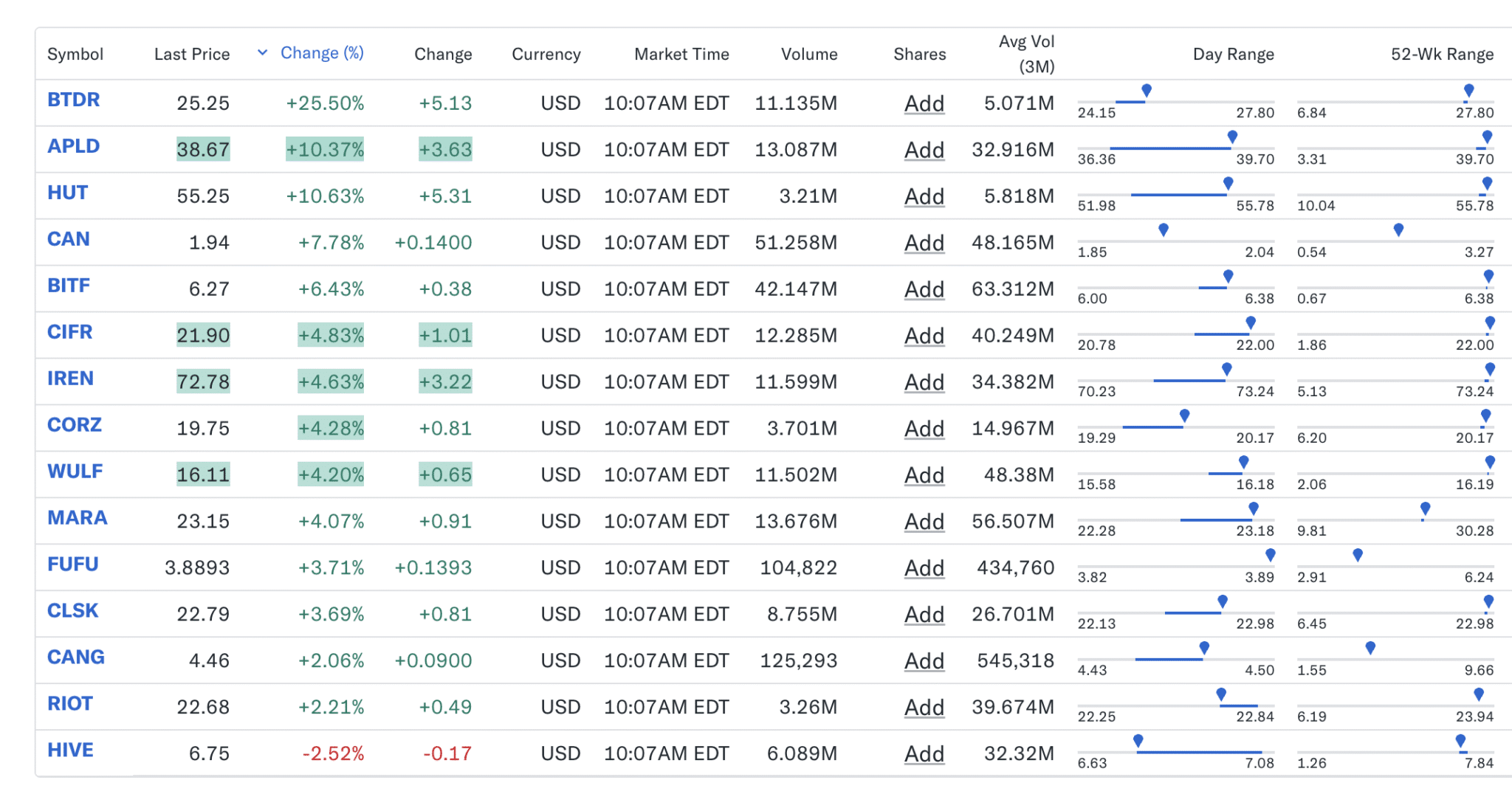 The momentum extended across nearly the entire sector. Applied Digital and Hut 8 also posted double-digit gains on Wednesday, while almost every other company is approaching or has set new 52-week highs.